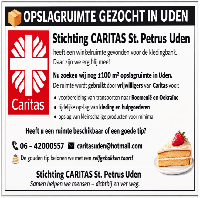 Werkruimte gezocht ! Wij Caritas zijn op zoek naar een nieuwe locatie voor onze kledingbank. Vanwege het vervallen van de huidige locatie, Pius-X kerk in Uden, is Stichting Caritas met spoed op zoek naar een nieuwe geschikte werkruimte. Caritas Uden zet zich in voor de minderbedeelden in de gemeente Maashorst; het inzamelen van gebruikte kleding…